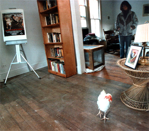 Sitting in her cluttered office, bundling material to mail, Davis hears a frenzied clicking noise and looks up. Freda Flower is racing across the wooden floor of the living room. She pokes her tiny head into the office. Davis beams at her like a proud parent interrupted by a precocious child. "No, dear, there's nothing new," she reports. Freda pauses to relieve herself. Davis is nonchalant about the mess; it happens frequently with chickens roaming the house, and she scoops it up with her bare fingers.
