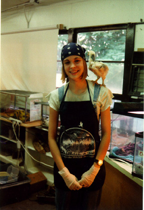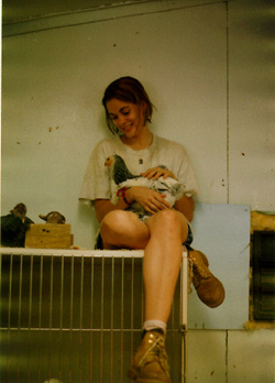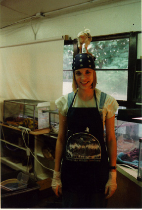 During the summer of 1995 I worked as a voluteer at the Chesapeake Wildlife Sanctuary (CWS) in Bowie, Maryland, twenty miles outside of Washington, D.C. CWS is a nonprofit shock-trama hospital for orphaned and injured wildlife. Chuckie the Chick came to CWS as someone's discarded school project. Chuckie had been born as part of an elementary school science project demonstrating how birds come from eggs. After he was hatched and school was over, the teacher no longer wanted responsibility for their class "experiment". So Chuckie was brought to CWS. Although CWS normally does not admit domestic animals, they made an exception for Chuckie and temporarily placed him in an aquarium until a more suitable environment could be found. A week went by, and Chuckie was still at CWS. Things were hectic at the Sanctuary that week and a placement home for him had not been located. But no one seemed to mind. Least off all me. In fact, I was quite amused by the spastic little chick running ragged in the fish tank. I began to get attached to him. About a week and a half later there was still no home for the chick. I named him Chuckie. When work was slow I would take him out and play with him. I'd let him wander around on the floor of the clinic. He'd tag along behind me. I asked the director of CWS if I could keep Chuckie and take him home with me to Ohio at the end of the summer. She said, "Yes." So, I began to spend a lot of my time with him.