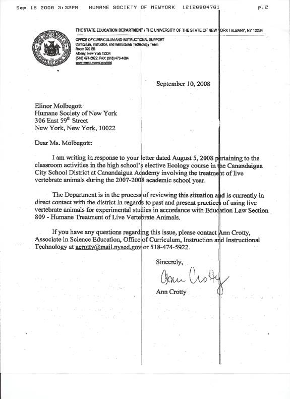 We urge you to review the chicken slaughter situation and to make it clear to schools that this is not permissible except as provided for in the law. We would also appreciate the opportunity to meet with a representative from the Education Department to discuss legislation to change the waiver requirement and replace it with language similar to that contained in the Intel Science Talent Search rules. Legislation to accomplish this was introduced this year in the NYS Legislature (A.585/S.5408).