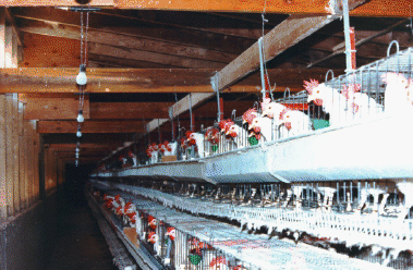 There are two strains of artificially bred birds at the farm: Hy-Line W36, designed for "livability" and to lay medium to large eggs; and DeKalb Delta, designed to lay very large eggs fast. As a result of their added burden, twice as many DeKalb Deltas die each day--10 to 12 per house compared to 5 to 6 Hy-Lines. Laying is based on lighting as well as genetics. The initial 12 hour day is increased 15 minutes every week up to 16 "henday" hours. Beyond this, the hen's system breaks down.
