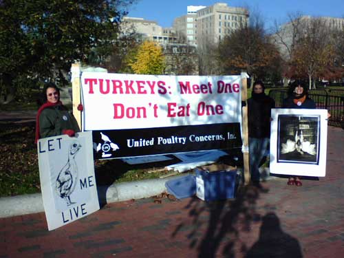 They cooked up a vegetarian Thanksgiving on Tuesday in front of the White House, handed out literature and wielded a banner emblazoned with the slogan, “Turkeys: Meet One, Don’t Eat One.”